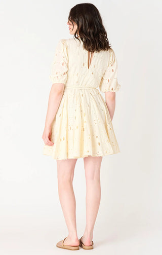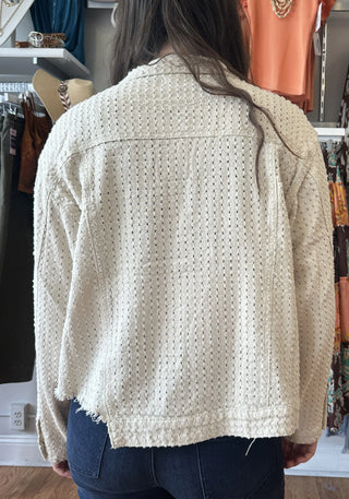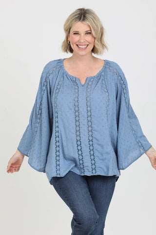 Elemental Blue Swiss Dot Top Open Crochet Bell Sleeve Blouse