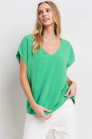 Kelly Green Short Sleeve Linen V-Neck Top