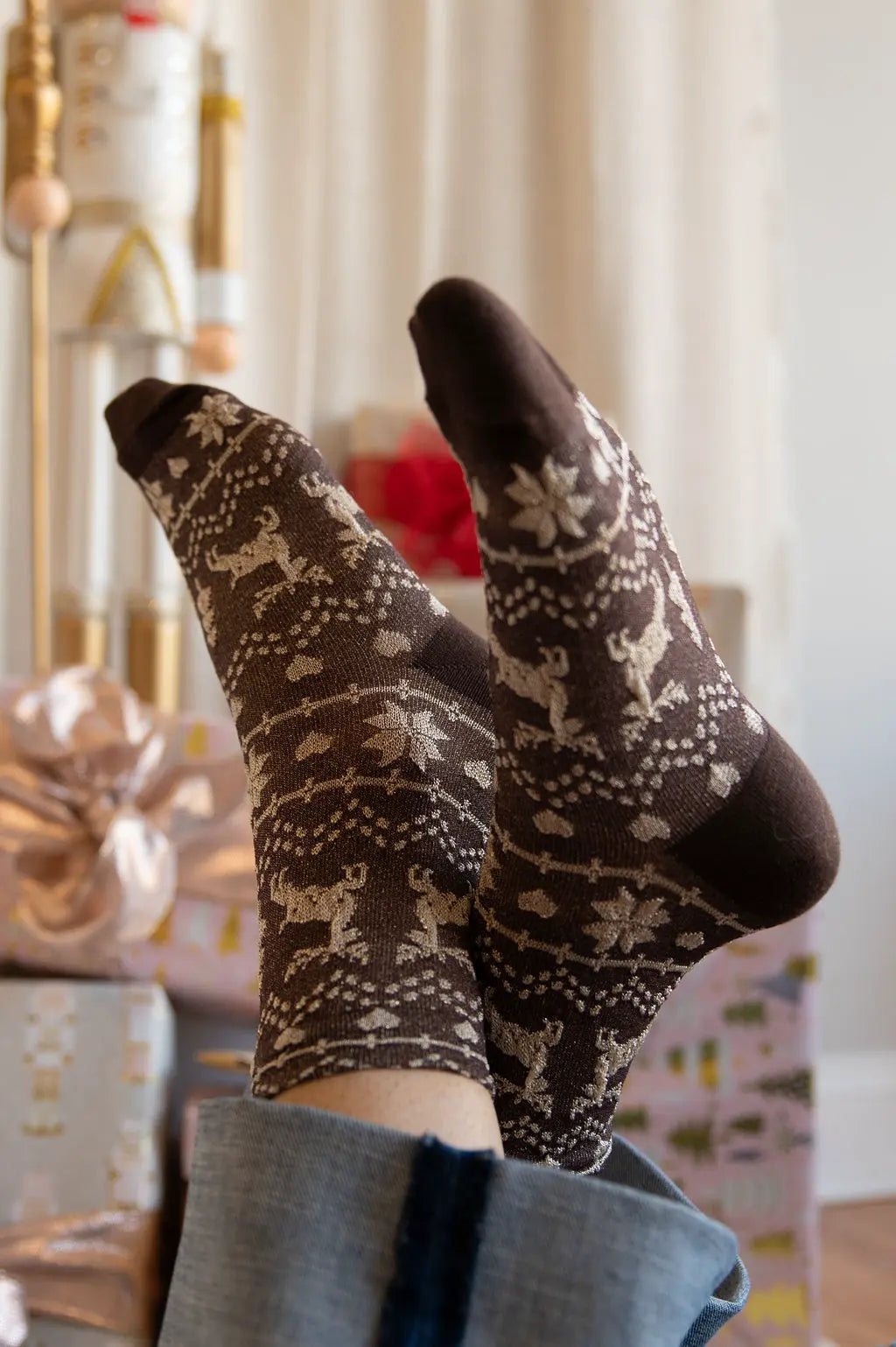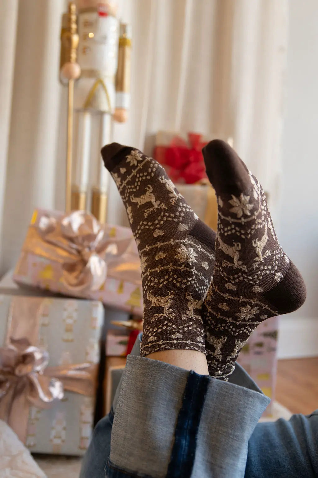 Style: A crew length that looks great peeking out from under casual jeans or pants, perfect for cozying up at home or attending holiday gatherings.